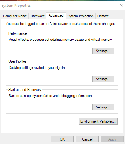 點擊左邊欄的Advanced sysyem settings(高級系統設置),點擊下面的Environment Variables(環境變量)