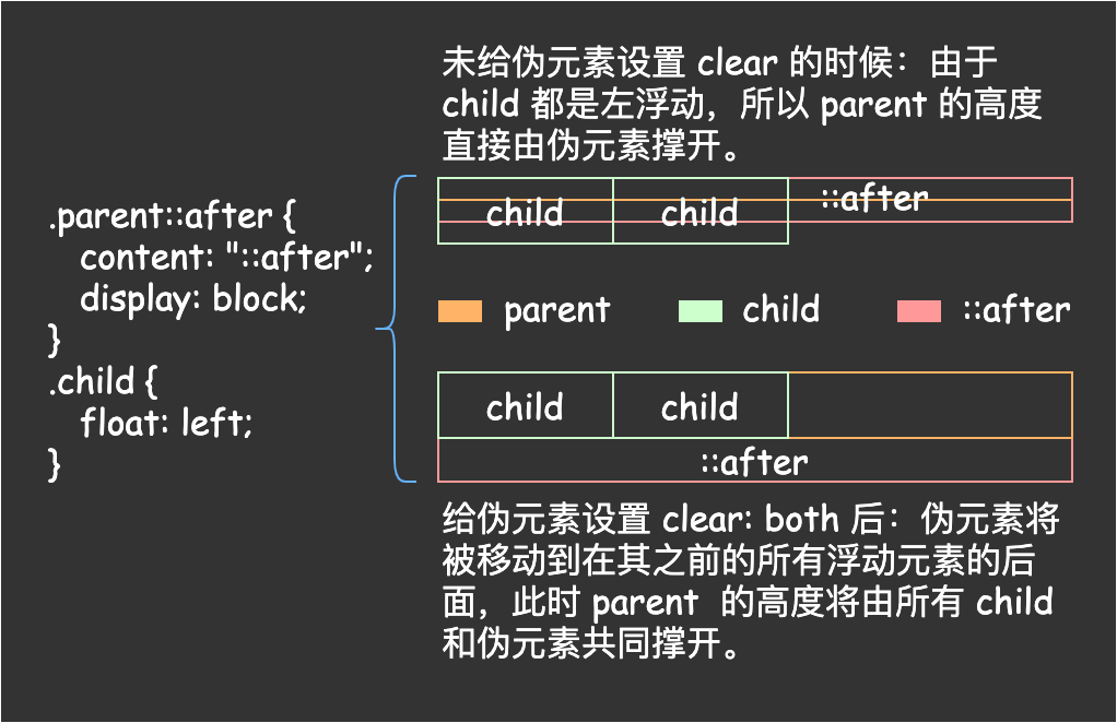 這種寫法的核心原理就是通過 ::after 偽元素為在父元素的最後一個子元素後面生成一個內容為空的塊級元素,然後通過 clear 將這個偽元素移動到所有它之前的浮動元素的後面,畫個圖來理解一下。