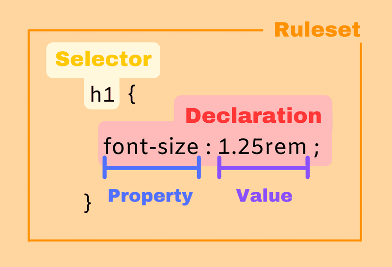 聲明塊如果需要作用到對應的 HTML 元素,那還需要加上選擇器。選擇器和聲明塊組成了 CSS 規則集(CSS ruleset),常簡稱為 CSS 規則。