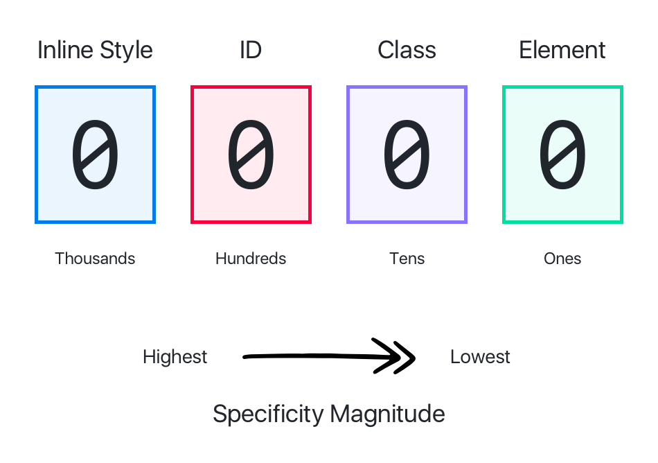優先級就是分配給指定的 CSS 聲明的一個權重,它由匹配的選擇器中的每一種選擇器類型的數值決定。為了記憶,可以把權重分成如下幾個等級,數值越大的權重越高: